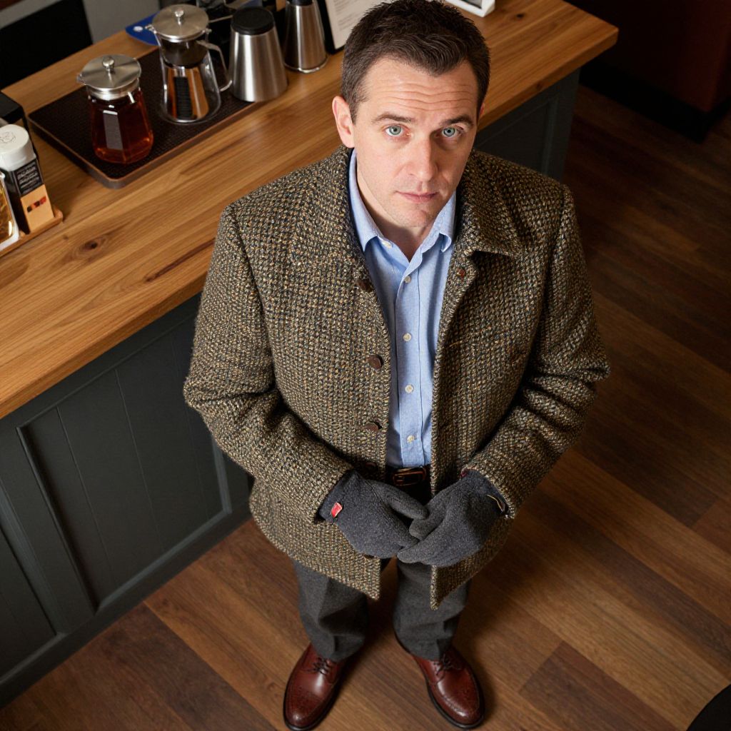 A man, classic tweed hunting jacket, thermal gloves, charcoal wool trousers, leather brogue shoes, light blue button-up shirt, cozy corner, coffee station, overhead shot, thoughtful expression, warm ambiance. Man has masculine face and piercing eyes