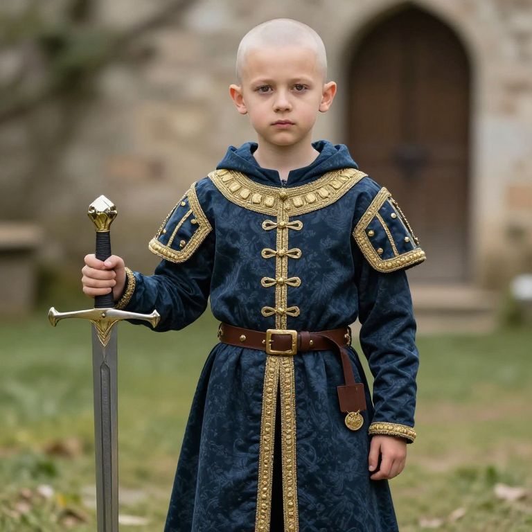 Fancy Dress For Bald Boy, boy in a medieval dress with a sword and a sword