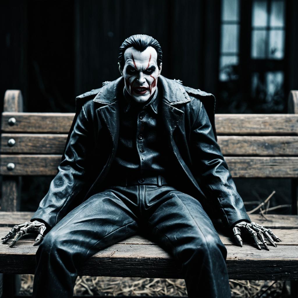 Realistic photo.Sinister action figure positioned on a rustic bench with a trapped entity, staring blankly into the camera, nightmare digital art, ultra-detailed, aesthetic horror style