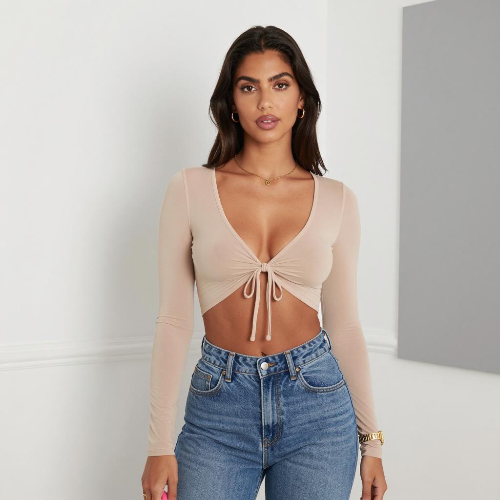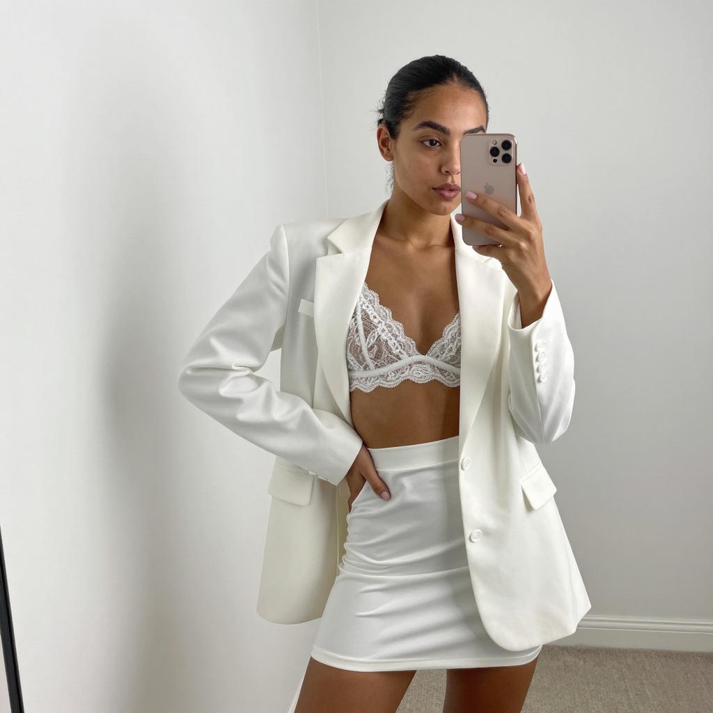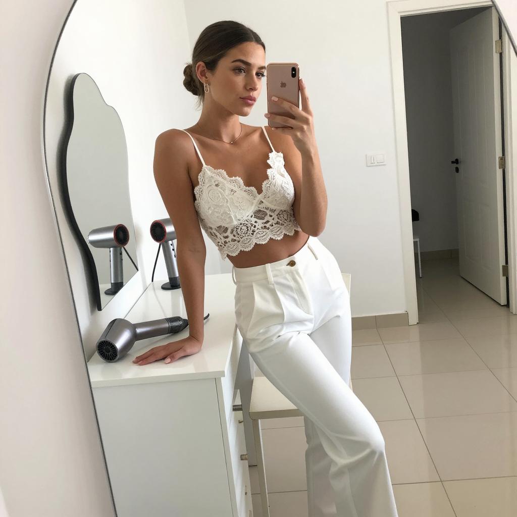 Young woman with medium-dark skin, long black hair, wearing a white tied crop top, white high-waisted skirt, beige wide-brim hat, large hoop earrings, gold necklace, and rings. She stands in a fitting room, holding an iPhone, taking a mirror selfie. Background includes beige dress on a hanger, white patterned curtains, and bright lighting. Her right hand rests on her hip.