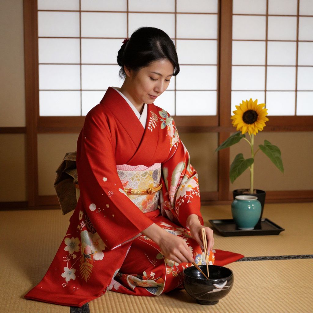 Seated gracefully on a tatami mat, a woman in a vibrant red kimono adorned with delicate floral patterns performs a traditional Japanese tea ceremony, her hands delicately holding a pair of chopsticks above a dark ceramic bowl, while a potted sunflower plant and a teal ceramic jar rest nearby, framed by a shoji screen window.