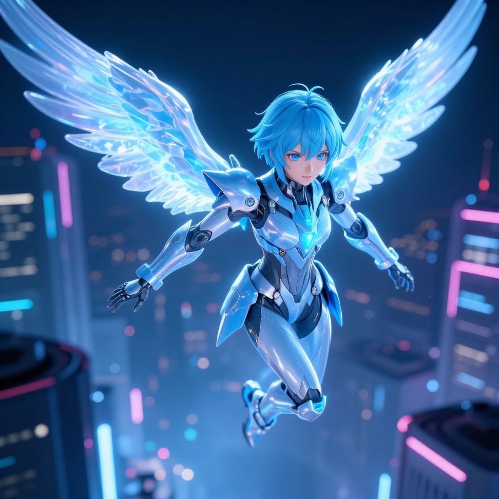 Light blue anime character with translucent wings flying above a futuristic cityscape at night, neon lights reflecting on sleek armor, cyberpunk style, detailed environments, dramatic lighting highlighting character expression.