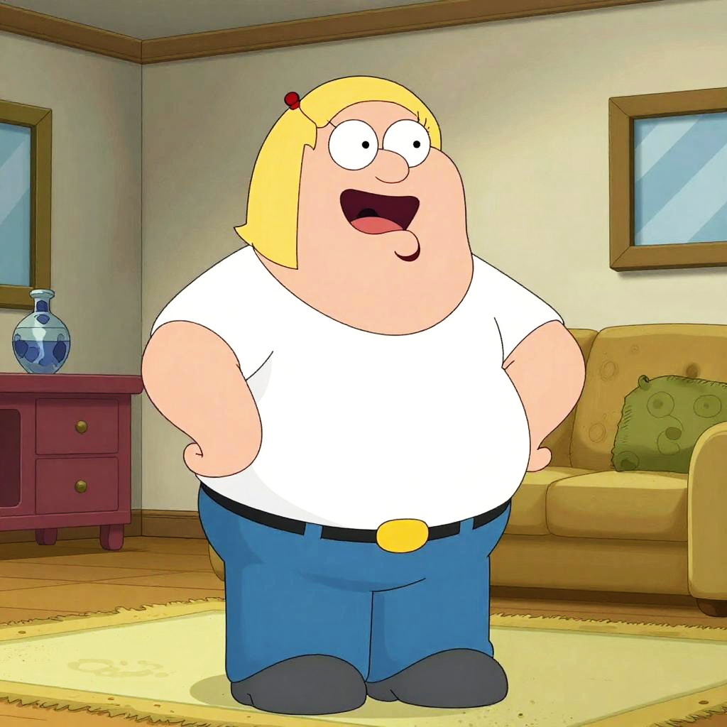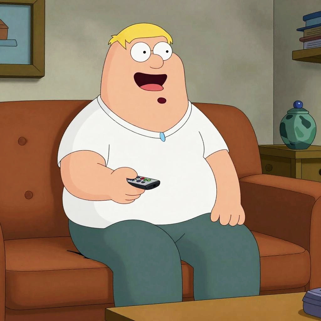 Family Guy style cityscape with characters resembling Peter and friends walking down the street, exaggerated features, bright cartoon palette, humorous ambiance