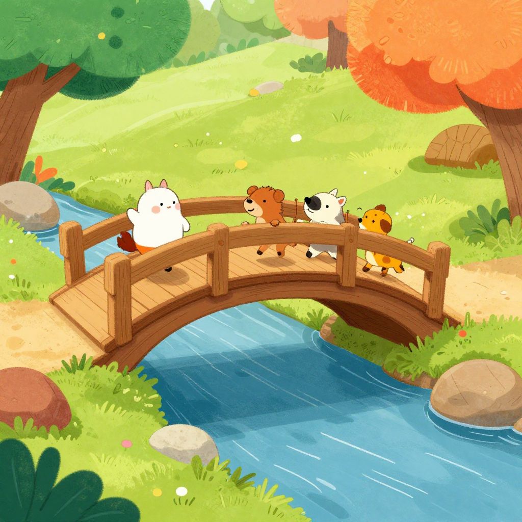 Cartoon-style image of five colorful animals crossing a wooden bridge over a blue stream in a vibrant, sunny forest.