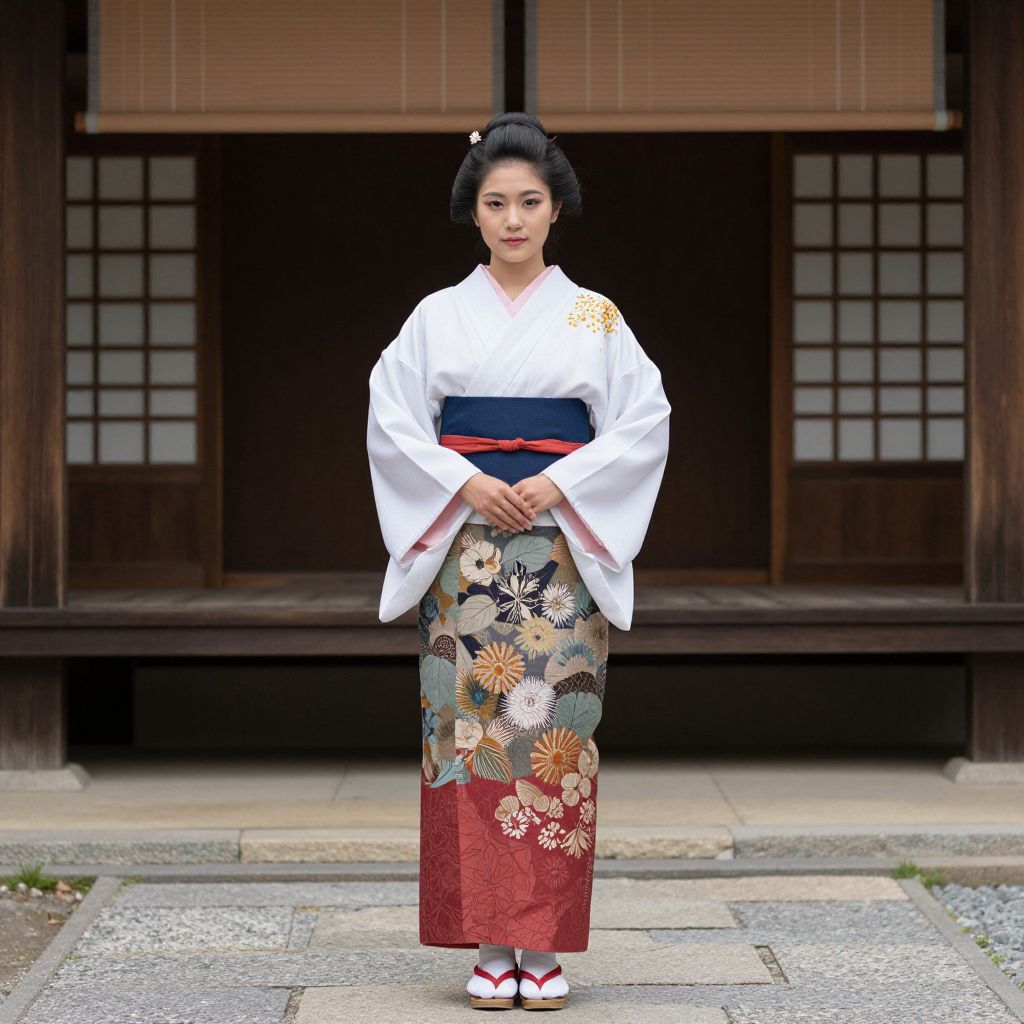 Photograph of a Japanese woman in traditional white kimono with floral patterns, navy obi, and red hakama, standing in front of a wooden
