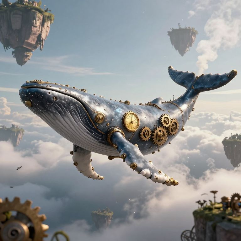 A colossal steampunk whale, adorned with intricate gears and a golden clock face, glides serenely through a sky dotted with floating islands, its mechanical body emitting plumes of smoke into the ethereal clouds.
