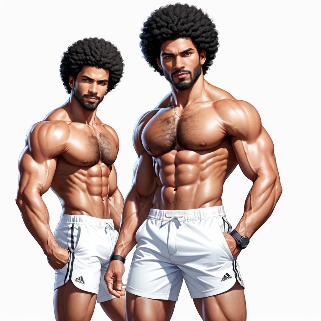 Portrait of a muscular athletic man with an afro hairstyle, standing confidently with hands on hips. He is shirtless, showcasing defined muscles, wearing white Adidas sports shorts with black stripes, and a wristwatch. The background is plain white, emphasizing the subject's physique.