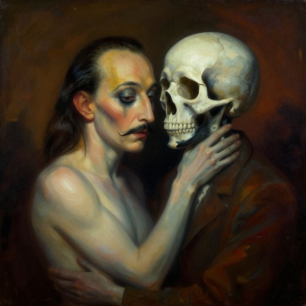 Digital painting of a topless woman with pale skin, dark hair, and red cheeks, gently touching a white skull, set against a dark, mo