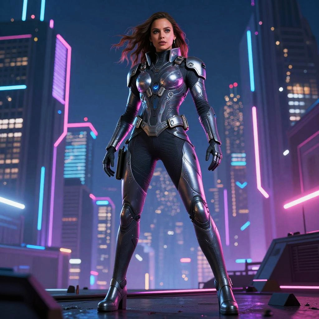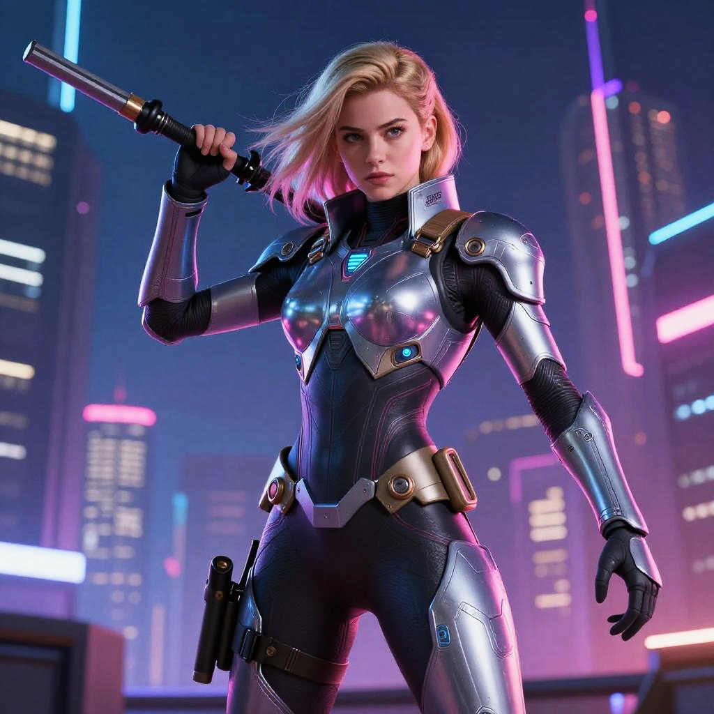 Natalie Portman as a futuristic Power Ranger, sleek armored suit with glowing neon lines, dynamic action pose in a vibrant cityscape at dusk, cinematic lighting