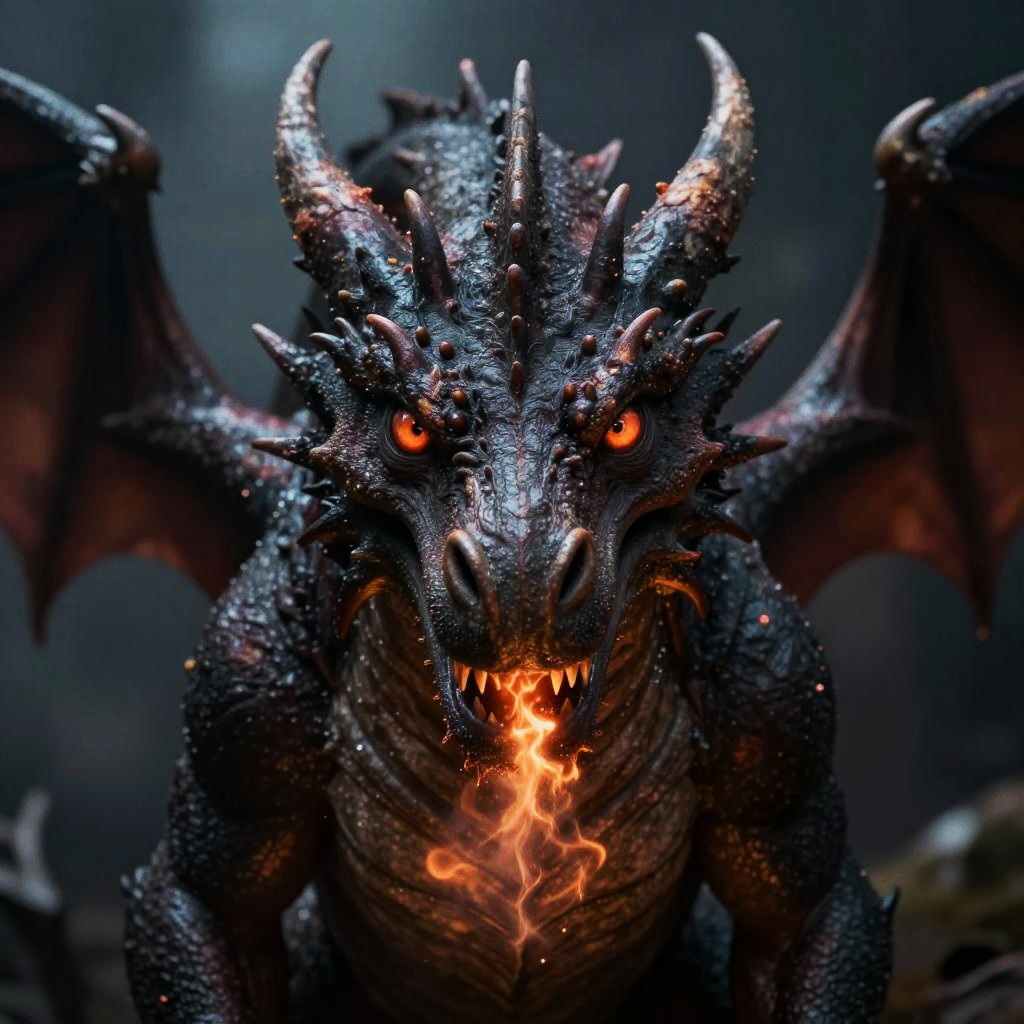 Dragon looking at camera, photorealistic style, close-up portrait with sharp focus on eyes and snout, fiery breath subtly visible, dark moody background, fantasy concept art