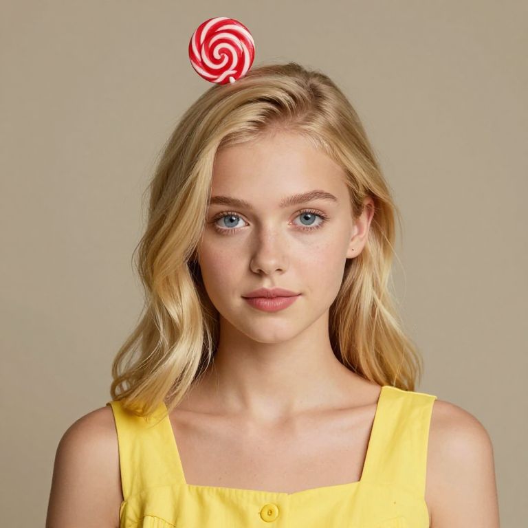 Girl with blonde hair and blue eyes wearing a yellow dress with a red and white lollipop on her head.