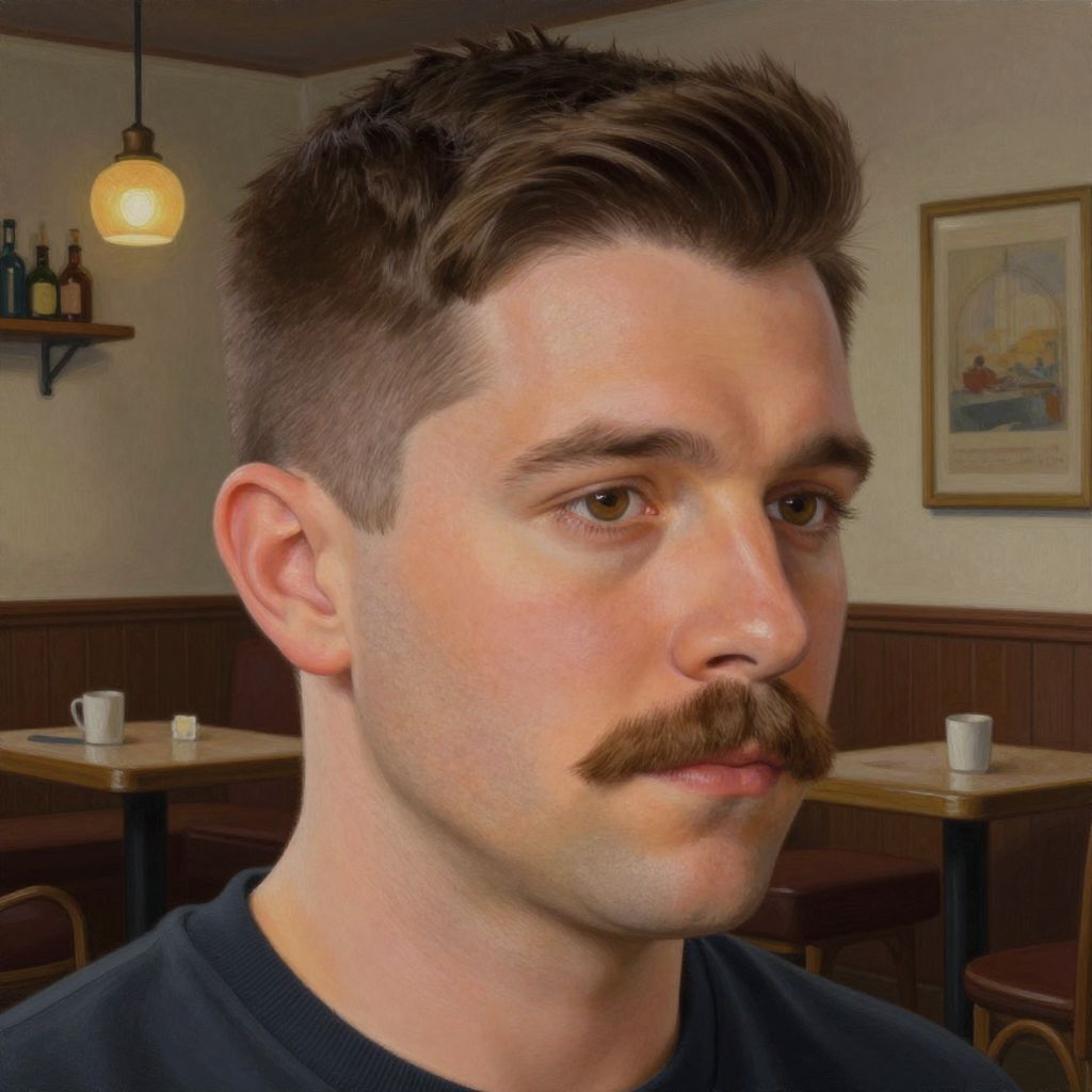Photorealistic digital portrait of a young man with short brown hair, mustache, and black shirt, sitting in a cozy café with wooden furniture and