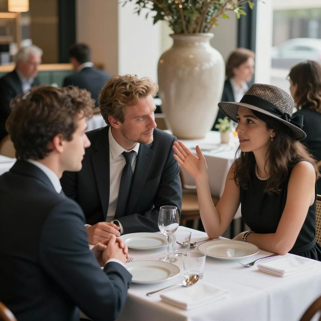 A man with a receding hairline wearing a checkered shirt gestures with his right hand while smiling and talking to a woman with light brown hair wearing a pink top. They are seated at a red checkered tablecloth in a casual restaurant setting. On the table are a silver cup, a plate with bread, and a plate with a napkin. Other diners are visible in the blurred background.