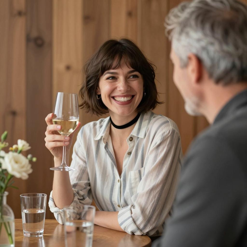 Man with receding hairline, wearing checkered shirt, gestures with right hand, smiling. Woman with light brown hair in pink top rests chin on hand, smiling. They sit at red checkered table in restaurant. Silver cup, bread, and napkin on table. Other diners in background.