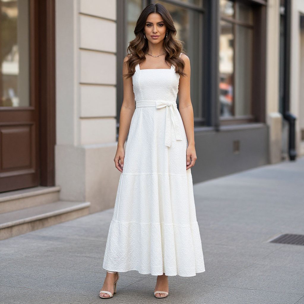 Photograph of a young woman with long, wavy brown hair standing on a city street. She wears a sleeveless, white, knee-length, lace-trimmed dress with a fitted bodice and a flowing skirt. She has a medium build and light brown skin, and she wears pink open-toed heels. The background shows beige stone buildings with large windows and dark brown doors. The street is paved with light gray concrete. The woman stands confidently, looking directly at the camera with a subtle smile. The lighting is natural, suggesting daytime.