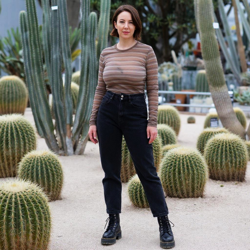 Photograph of a Caucasian woman with shoulder-length dark brown hair, standing in a cactus garden. She wears a sheer, striped, long-sleeve top revealing a brown bra, paired with high-waisted, black, straight-leg jeans, and black combat boots. Her expression is neutral, and she stands with her hands relaxed by her sides. The background features various green cacti with round and columnar shapes, set against a blurred, outdoor urban environment. The ground is covered in light-colored gravel. The image has a vibrant, slightly over-saturated color style.