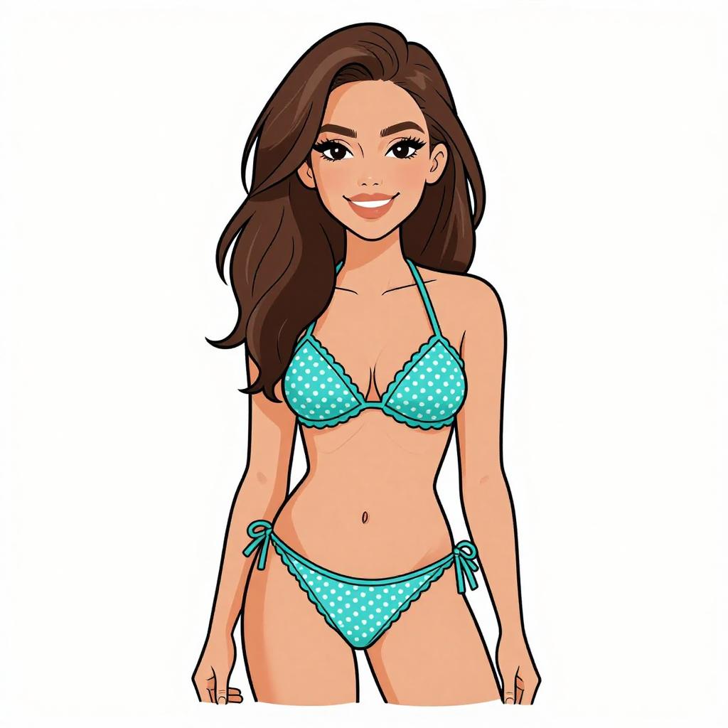 Woman with pretty face and pretty hair. smiling Woman, contemporary swimwear, two-piece bikini in teal, dotted mesh overlay, underwire demi-cup top with scalloped edges and thin adjustable straps, matching low-rise bikini bottom with similar scalloping detail, simple studio background --sref 1467