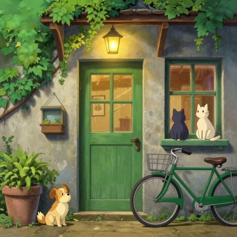 The image depicts a charming, whimsical scene reminiscent of Studio Ghibli's animated films. A quaint, green door with a small window is the focal point, flanked by a window with a grid of panes. Above the door, a lantern hangs, casting a warm glow. The walls are adorned with ivy and potted plants, adding a touch of nature to the scene. Two cats sit on the windowsill, one near the window and the other closer to the door, seemingly observing their surroundings. A bicycle leans against the wall, its green frame matching the door, and a small dog sits on the ground to the left of the door. The overall composition is balanced, with elements arranged in a harmonious manner, creating a sense of tranquility and nostalgia.