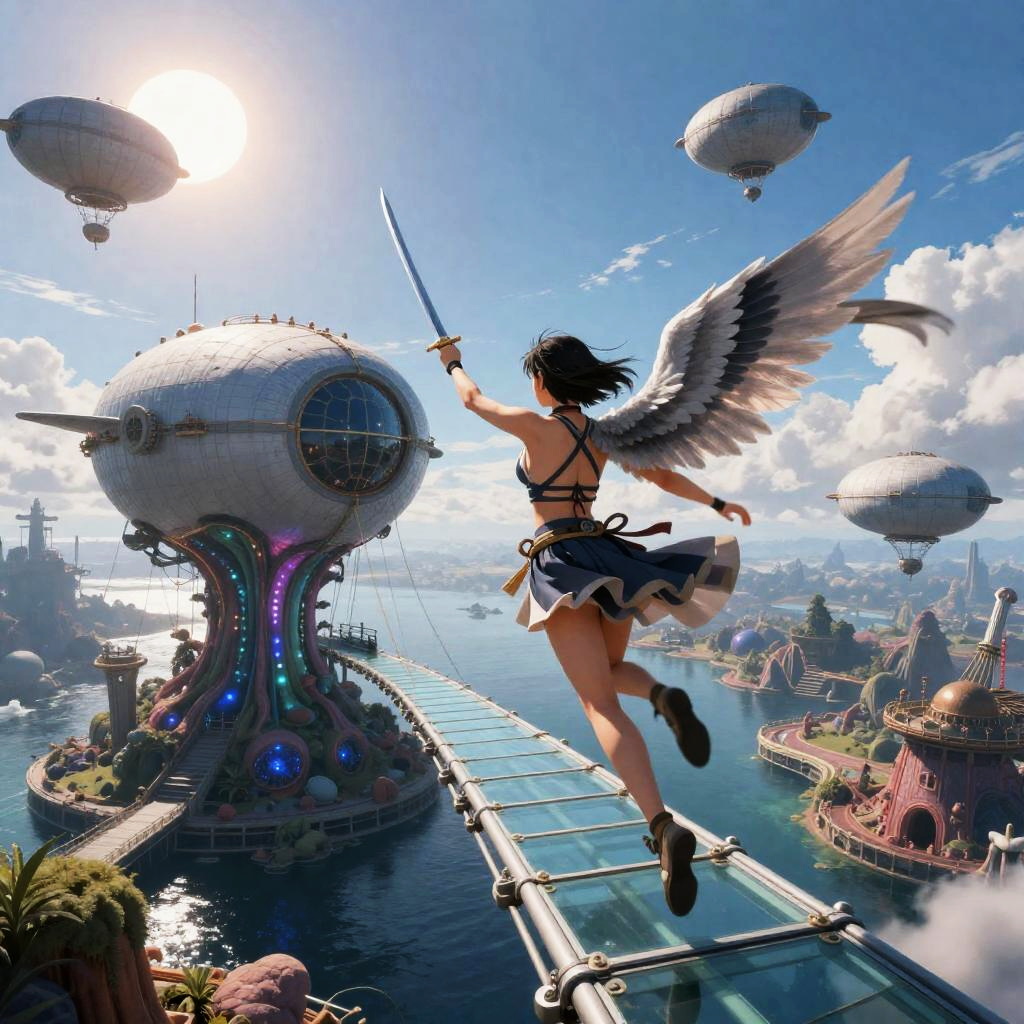 Winged miniskirt swordswoman (aerial duelist, flowing scarf, perfect voluminous body), Artist 1, Surreal, mysterious, bizarre, fantastical, fantasy, sci-fi, Japanese anime, airship moored to a bioluminescent living-reef aerial wharf with tethered zeppelins and rickety glass bridges under twin-sun dawn, miniskirt beautiful swordsman running towards the airship on the tethered rope, perfect voluminous body, blue sky, clouds, detailed masterpiece bird’s eye views