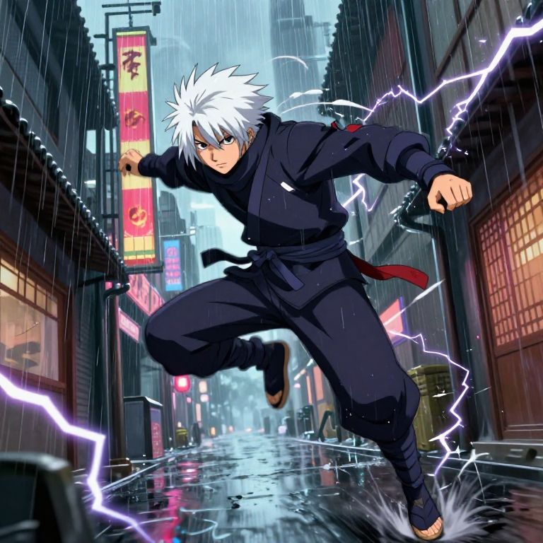 Anime-style drawing of a white-haired ninja in black clothes, running through a rainy, neon-lit urban street, surrounded by lightning.