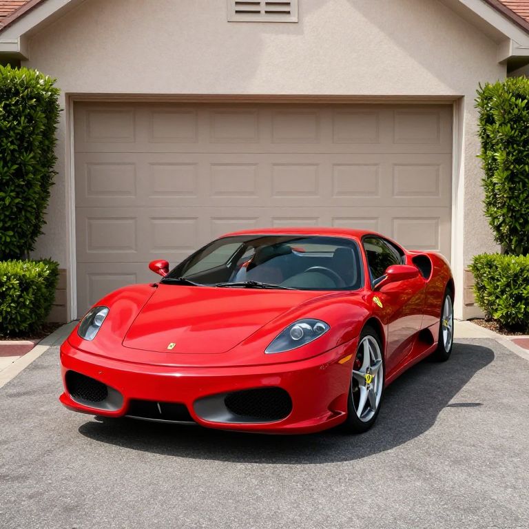 Shiny red 2007 Ferrari F430 with a six-speed manual transmission parked prominently in front of a beige garage door, flanked by neatly trimmed green hedges and casting a sharp shadow on the asphalt driveway.
