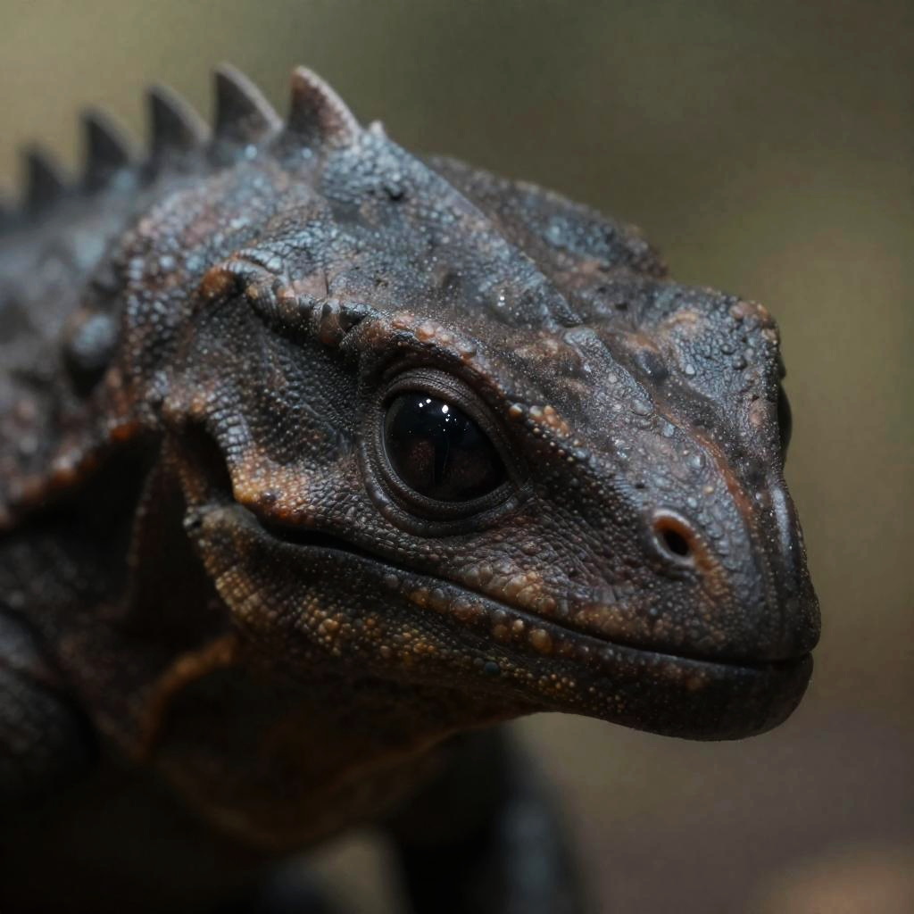 Close-up photograph of a dark, ured, reptilian creature's head with rough, scaly skin, large black eyes, and spiked ridges. The creature's head is turned slightly to the side. Dim, yellowish lighting enhances the ure.