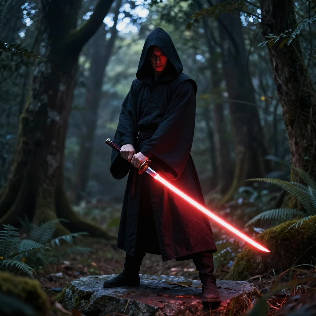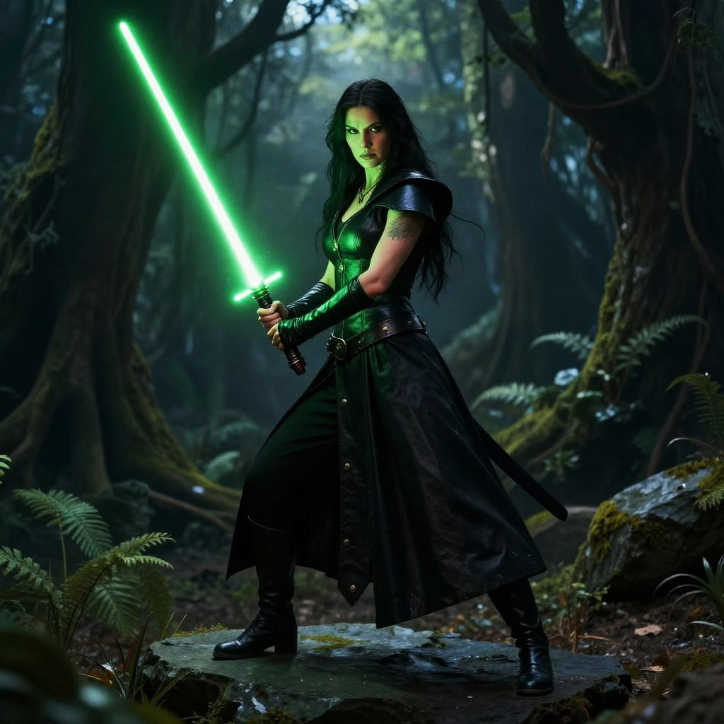 Full-body portrait of shadow assassin standing on an ancient stone pedestal, holding a bright green lightsaber that illuminates a dark, magical forest scene. Shot with Hasselblad X2D 100C, XCD 2.5/90V 71mm lens, f5.6, 1/1000s, 8K resolution, intricate details and shadows from lightsaber glow
