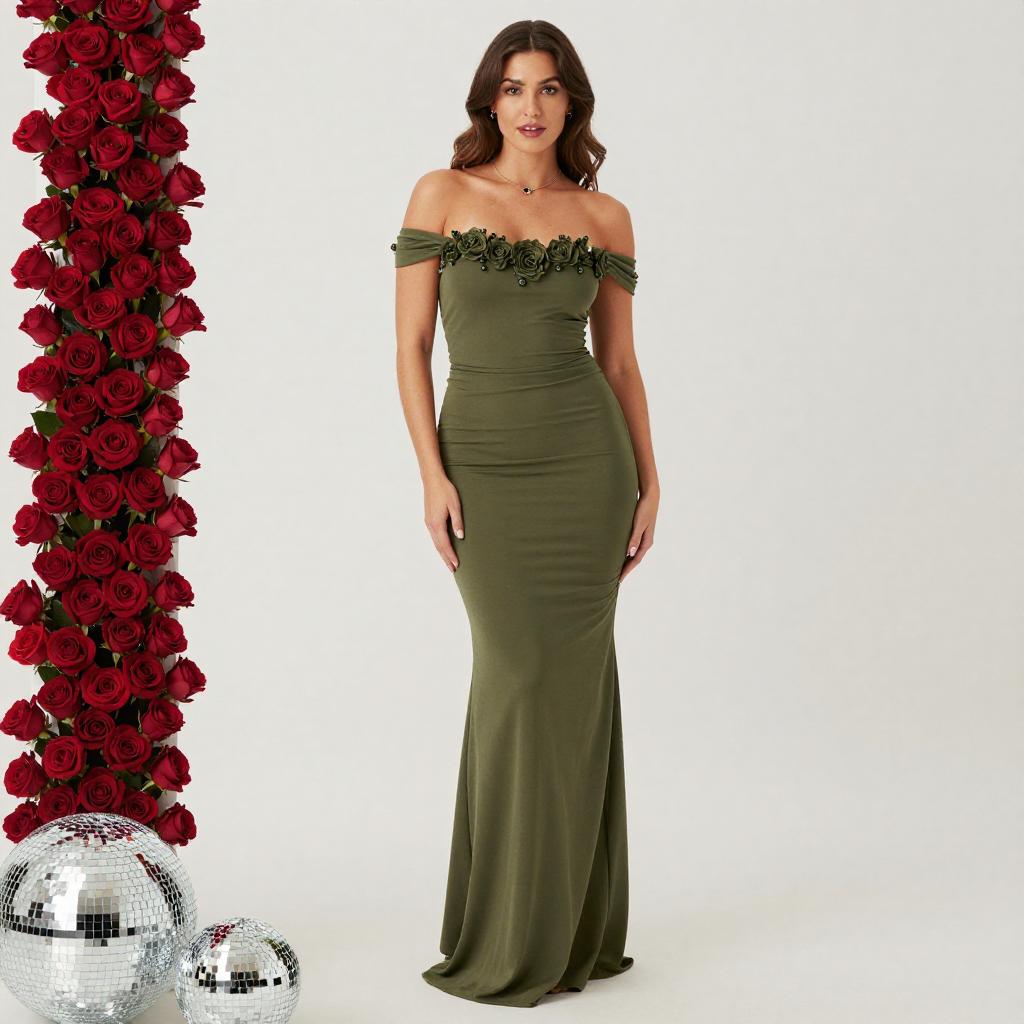 Photograph of a woman with long brown hair, wearing an off-the-shoulder, olive green, floor-length dress with a floral embellishment on the chest. She stands against a white background with a tall arrangement of red roses on the left and a silver disco ball at the bottom. She wears a simple necklace and has a confident, poised stance.