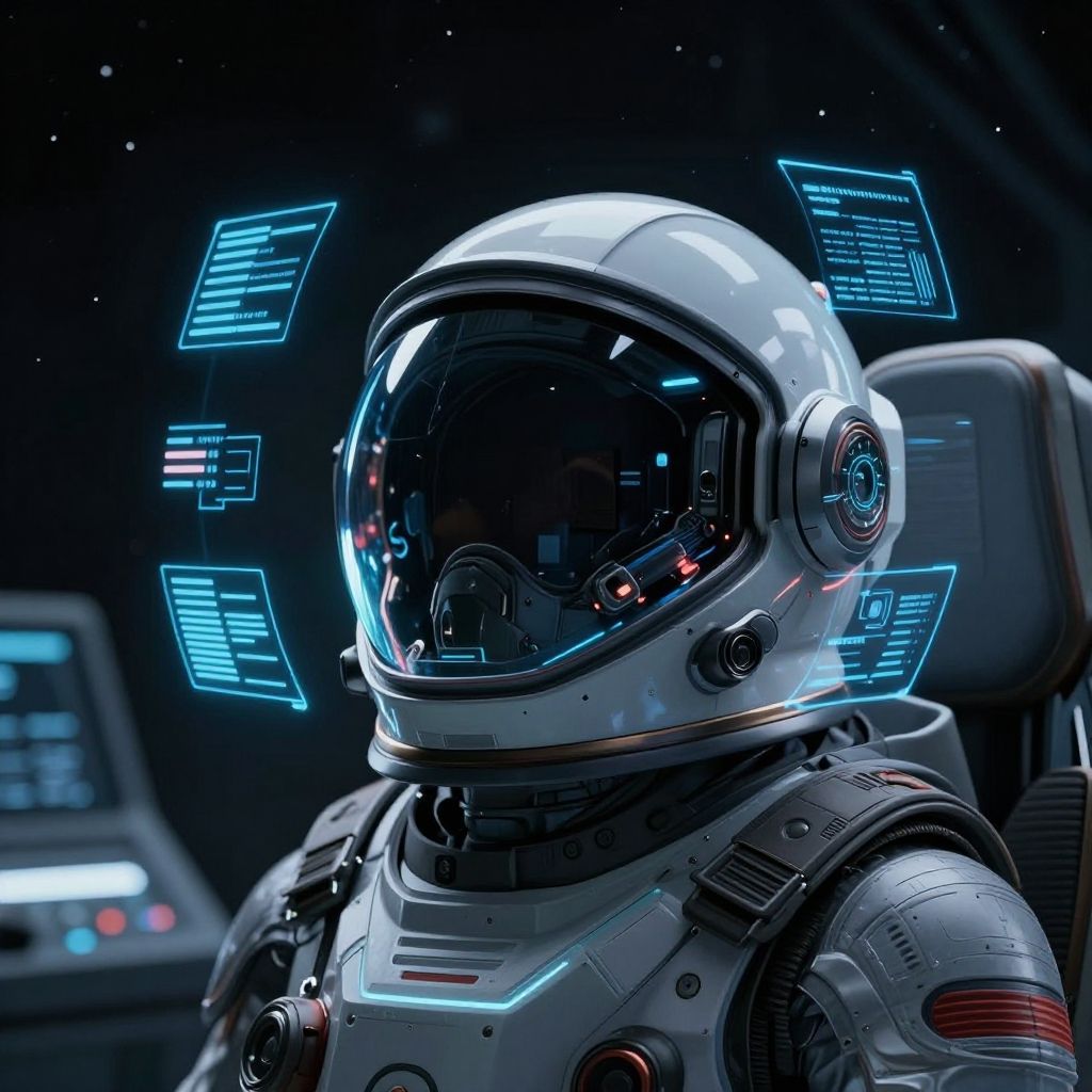 Futuristic space helmet with holographic interface projections around it, sleek aerodynamic design highlighting advanced technology, set in a dark spaceship cockpit with starry void outside