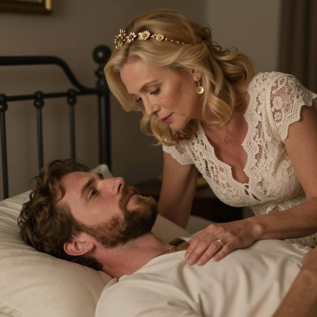 Middle-aged woman with blonde hair in lace dress, gold earrings, and headpiece leans over a bearded man lying in bed. She holds his hand, looking down at him with a gentle expression. Dark metal bed frame in background. Dim lighting.