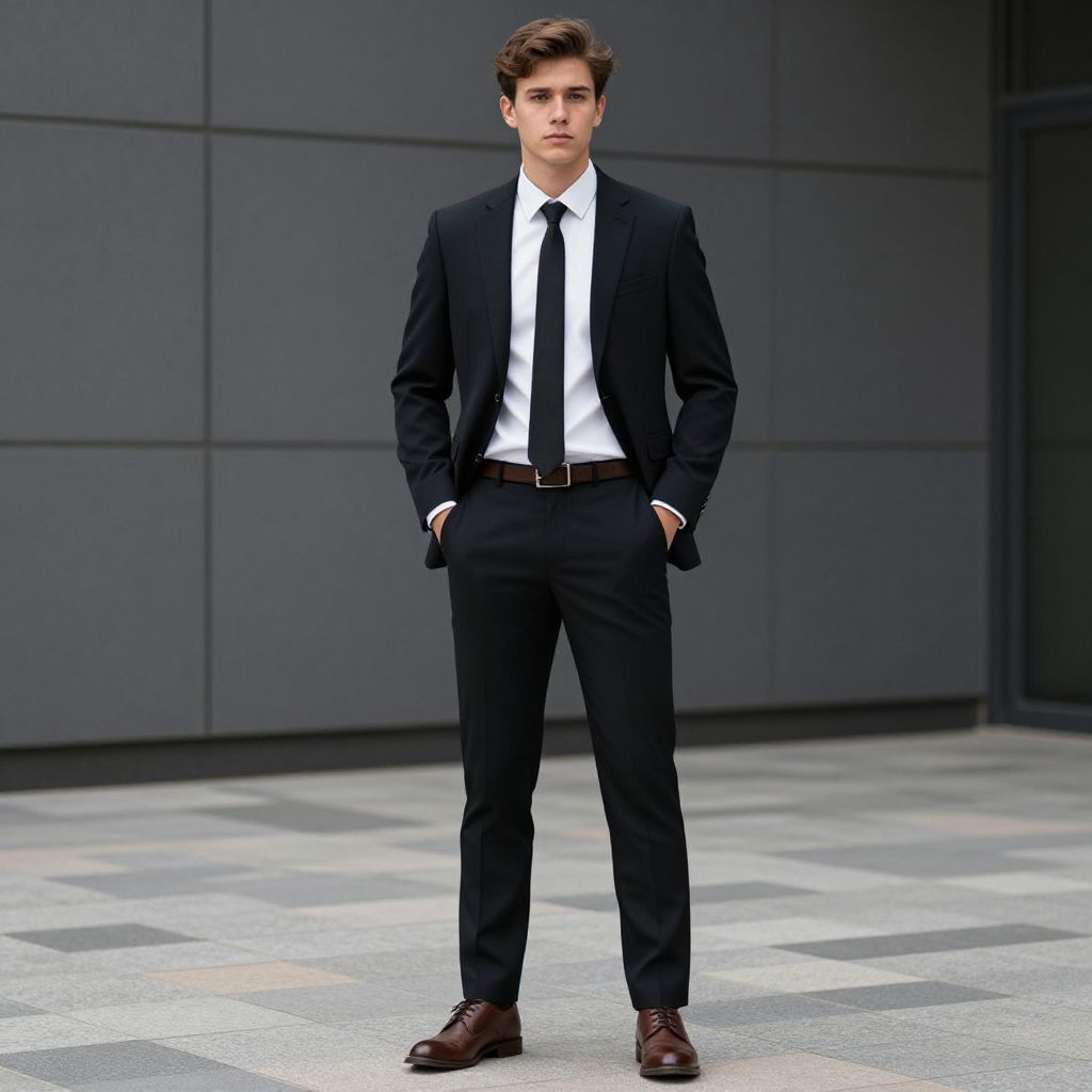 Photograph of a young, Caucasian man standing confidently in a modern, urban setting. He has short, dark brown, slightly wavy hair and a clean-shaven face. He wears a sleek, black suit with a white dress shirt and a black tie. His hands are casually tucked into his pants pockets. He completes his outfit with polished, dark brown leather shoes. The background features a gray, paneled wall and a checkered stone pavement, giving a minimalist, corporate vibe. The lighting is natural, highlighting his formal attire and poised stance.