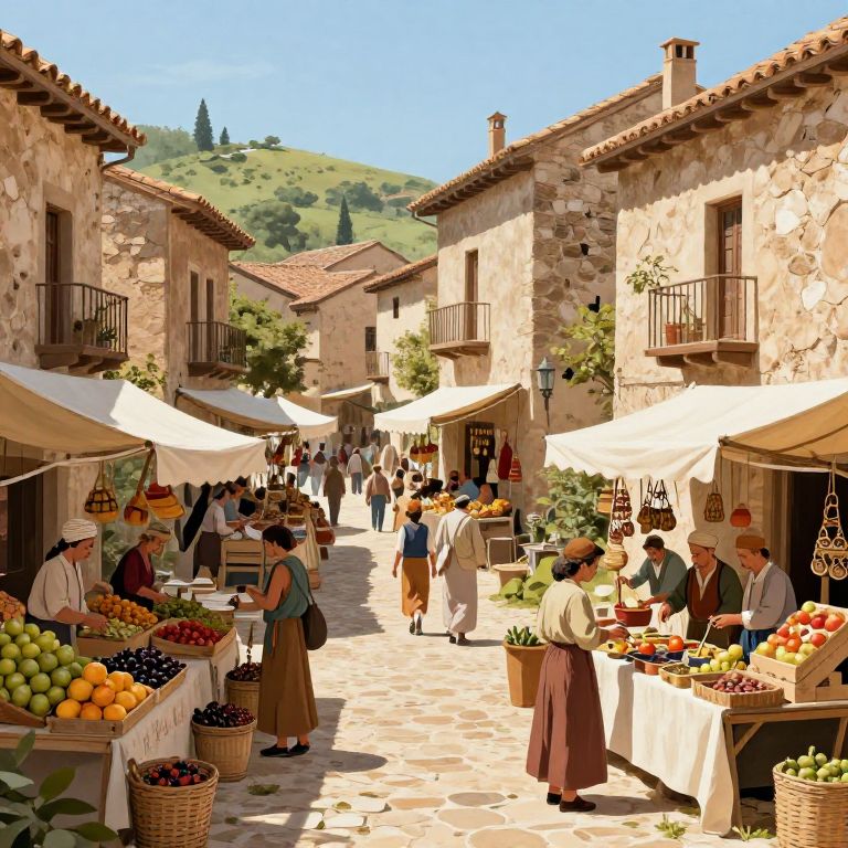 Picktures of a vintage marketplace in a quaint European village, cobblestone streets and colorful stalls filled with fresh fruits and flowers, warm sunlight casting long shadows, painterly style with rich textures.