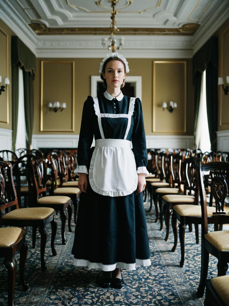 Maid Costume Long Sleeve, woman in black dress standing in a large room with chairs