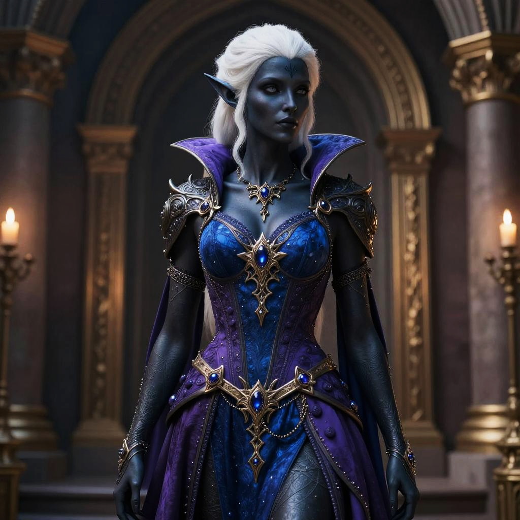 Female dark elf drow, dark [blue|grey] skin tone with white hair top ponytail. wearing beautiful elegant blue and purple dress, wealth oppulent gothic elaborate magnificent (zrpgstyle) (masterpiece:1.2)(best quality:1.2) (detailed) (intricate) (8k) (HDR) (cinematic lighting) (sharp focus)
