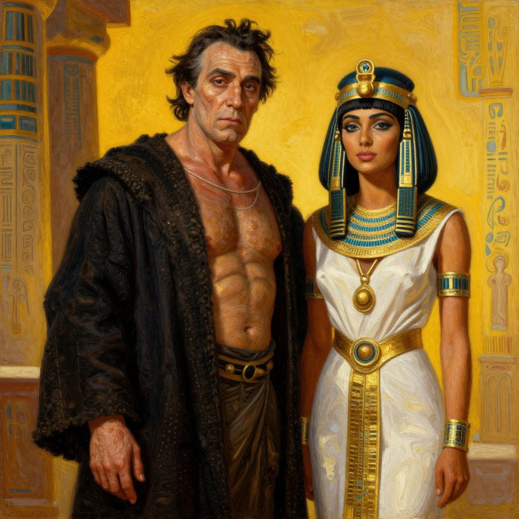 Digital painting of a muscular, shirtless man in a black fur robe beside an Egyptian woman in white dress and headdress.