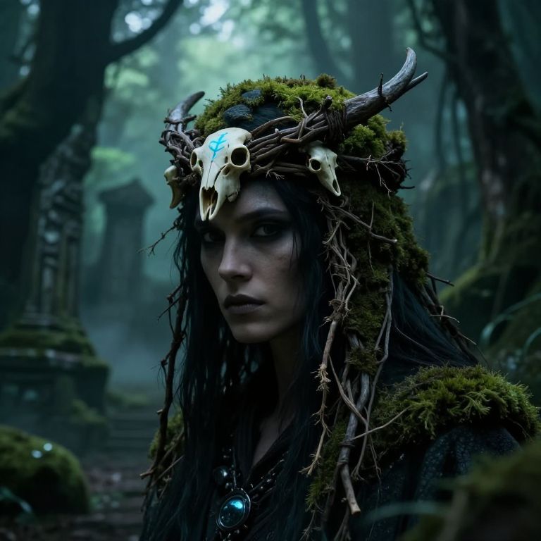 Photograph of a woman with long, wild black hair standing in a dark, dense forest. She wears a tattered, brown, fringe-laden dress that reaches her ankles, and her hands are visible with dirt smudges. The forest background is shadowy with tall trees and thick foliage, illuminated by a dim, cloudy sky. Her expression is serious and slightly menacing, with a strong, focused gaze directed at the camera. The overall mood is eerie and mysterious, with a dark, moody color palette dominated by blues and greens.