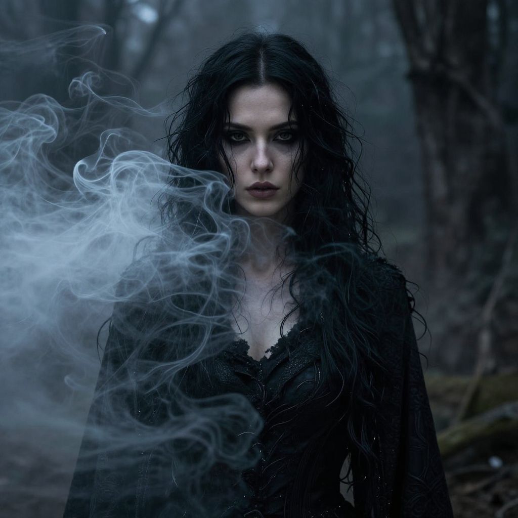 Photograph of a mysterious, long-haired woman in a tattered, dark forest dress, standing in a dimly lit, foggy forest. Moody