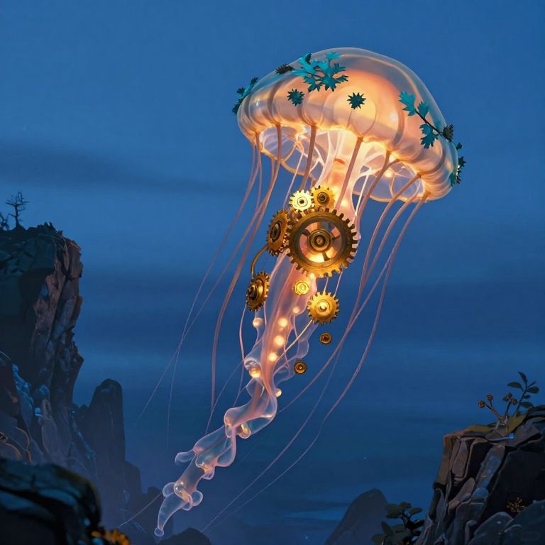 Massive, bioluminescent tentacles of a clockwork jellyfish gracefully cascade through the twilight sky, their intricate gears and golden cogs glowing warmly against the deep azure backdrop, while the jellyfish's dome-shaped body, adorned with teal foliage and illuminated from within, floats serenely above jagged rocky formations.