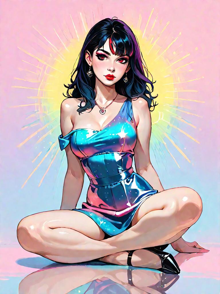 1girl, source_comics, realistic face, full body shot, Woman, modern cocktail, sleeveless mini dress in solid black, sheer mesh panel at neckline, embellished shoulder detailing with studs and beading, body-hugging silhouette, bracelet cuffs with matching embellishments, dark blue studio background