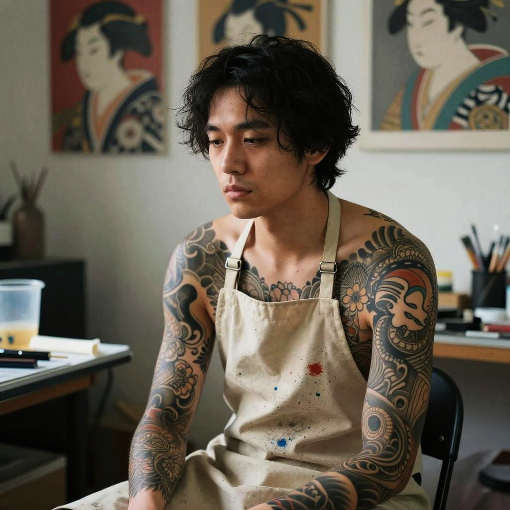 Realistic photo.tattooed artist, highly detailed and realistic, intricate tattoos, wearing paint-splattered apron, vibrant art studio, serene and contemplative expression, moody lighting, inspired by Japanese art, subtle textures and natural colors realistic photo