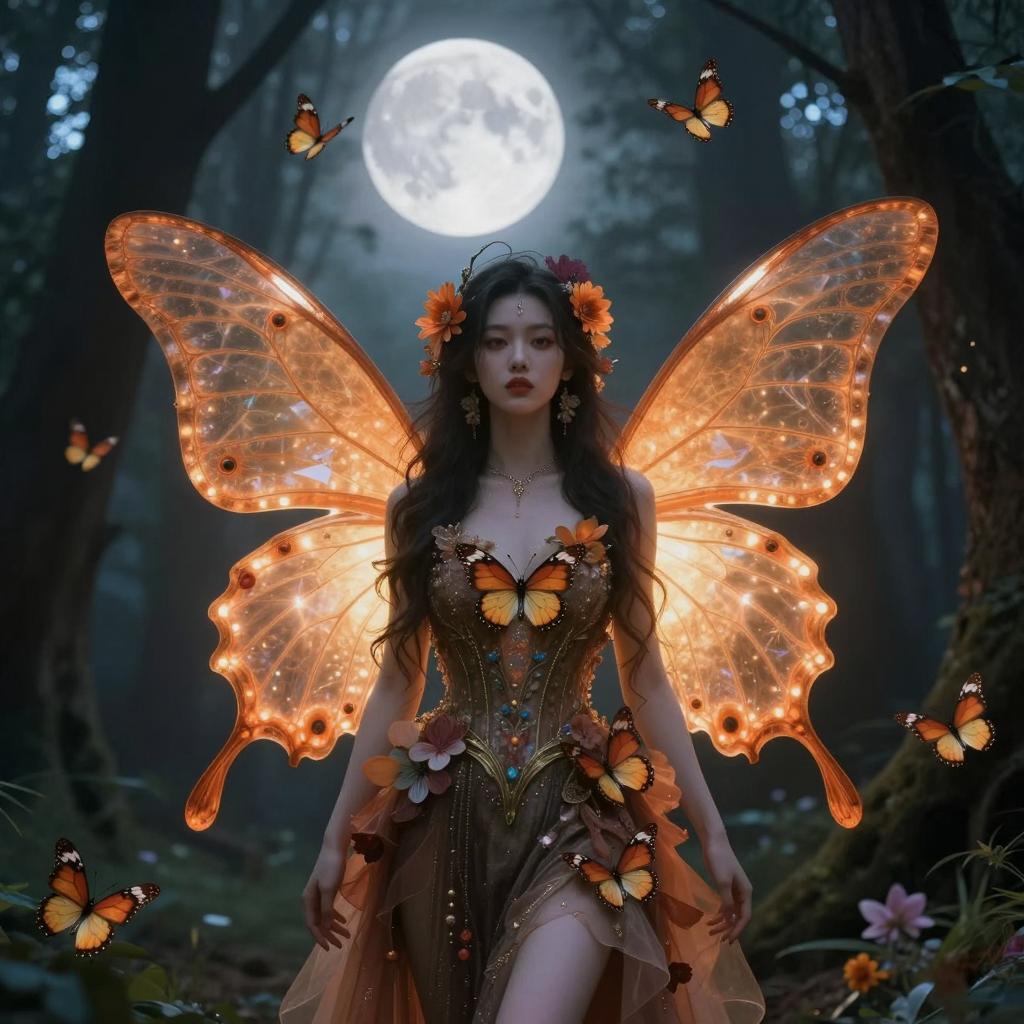 A mystical woman adorned with glowing orange butterfly wings and intricate floral elements stands in an enchanted forest under a luminous full moon. Her ethereal appearance is enhanced by a dark, ornate dress with butterfly motifs, set against a background filled with fluttering butterflies and moonlit trees in a fantasy art style.