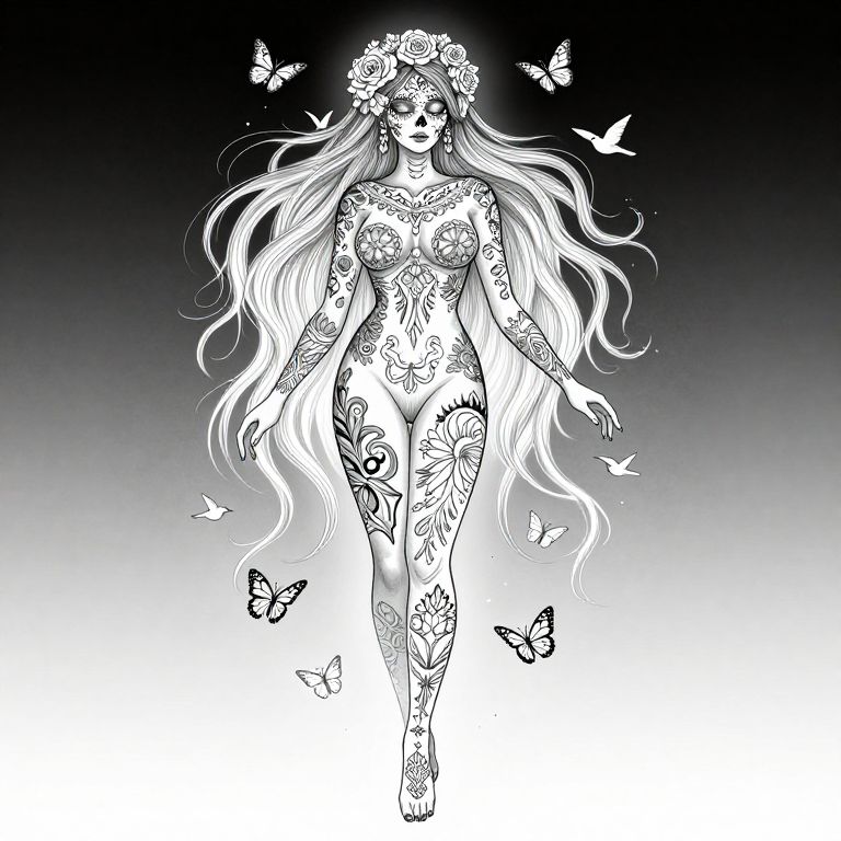 The image is a detailed line art illustration of a full-body figure adorned with intricate Day of the Dead tattoos. The central figure, with long, flowing hair, is depicted in a flowing, almost ethereal manner, suggesting movement and grace. The tattoos cover the entire body, featuring elaborate designs that include floral patterns, swirls, and other decorative motifs. The figure wears a braided headpiece with roses, adding to the floral theme. Butterflies and birds are scattered throughout the image, enhancing the ethereal and mystical atmosphere. The background is a gradient of dark to light shades, creating a dramatic effect that draws attention to the figure and her tattoos. The overall composition is balanced, with the figure centrally positioned and the tattoos and accessories adding depth and complexity to the artwork.