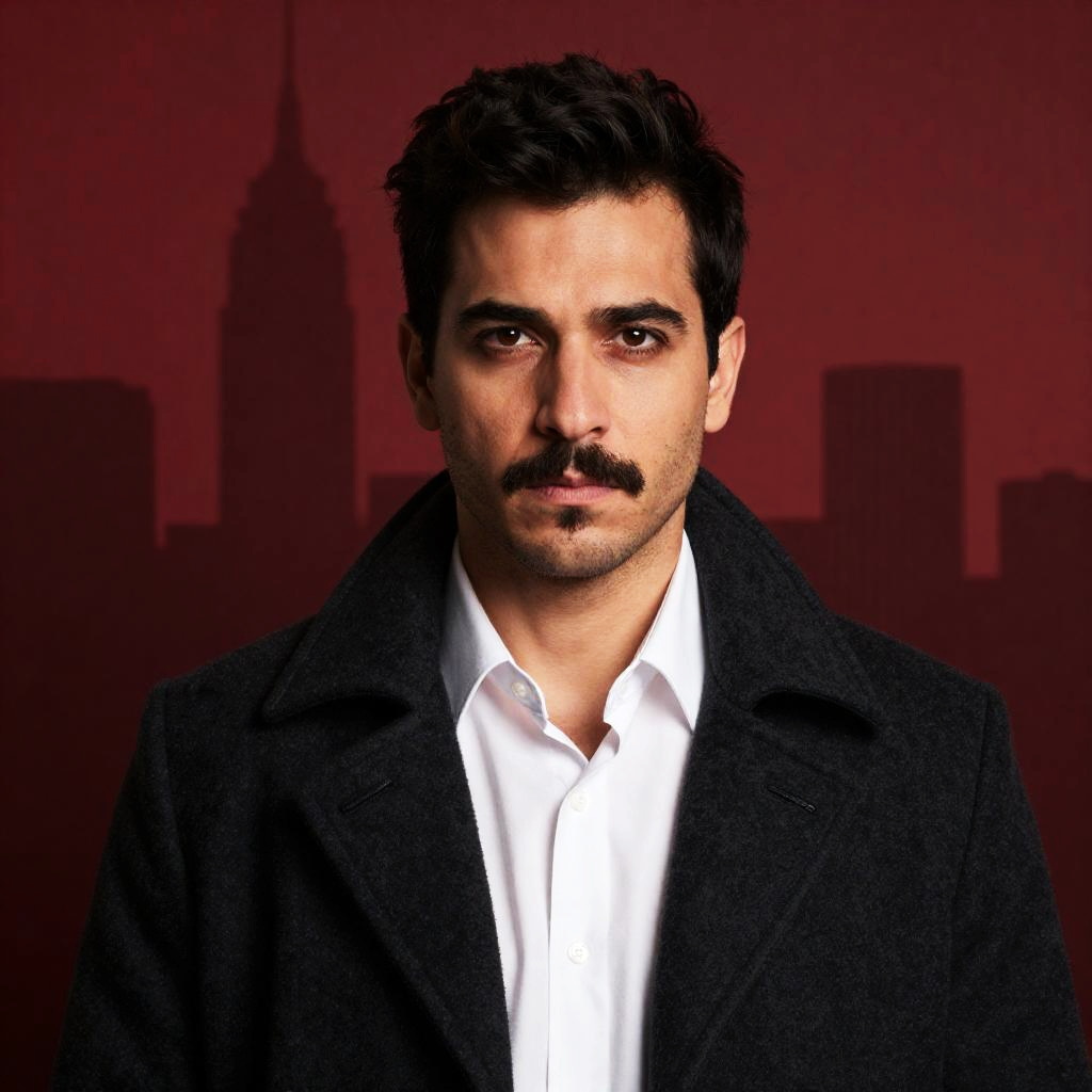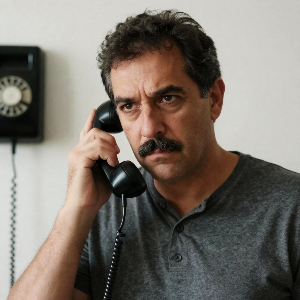 Photograph of a middle-aged man with dark brown hair and mustache, sitting on a black chair. He wears a light gray suit, blue tie, and white shirt with a blue pocket square. He holds a beige book in his right hand. The background is a plain, light gray wall. His facial expression is serious and focused. The man is positioned slightly to the right.
