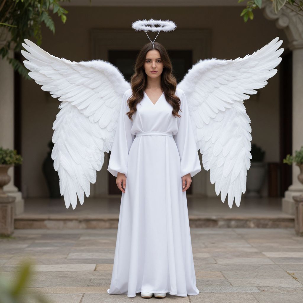 "White Fallen Angel Costume, a woman dressed in a white robe and angel wings stands in a courtyard"