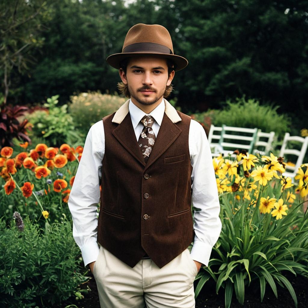 A young man standing outdoors in a lush garden surrounded by colorful flowers. He is wearing a brown fedora hat, a brown vest with a cream-colored collar over a white collared shirt, a patterned brown necktie, and light beige pants. The man has medium-length brown hair, light facial hair, and is looking directly at the camera with hands in pockets.