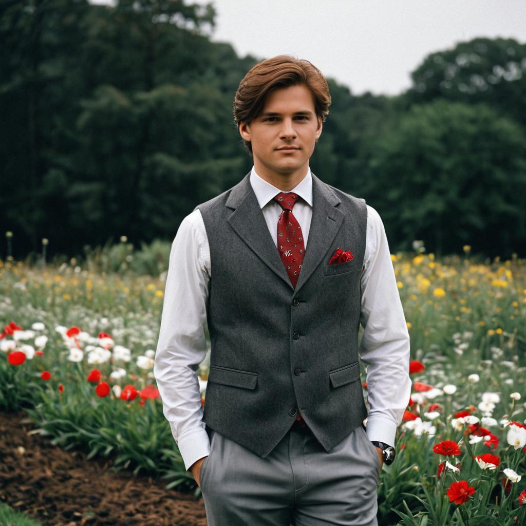 Garden party chic attire,1boy, male focus, solo, necktie, hat, flower, shirt, brown hair, jacket, vest, pants, brown headwear, white shirt, looking at viewer, realistic, facial hair, brown jacket, manly, collared shirt, standing, outdoors, brown vest, suit, formal