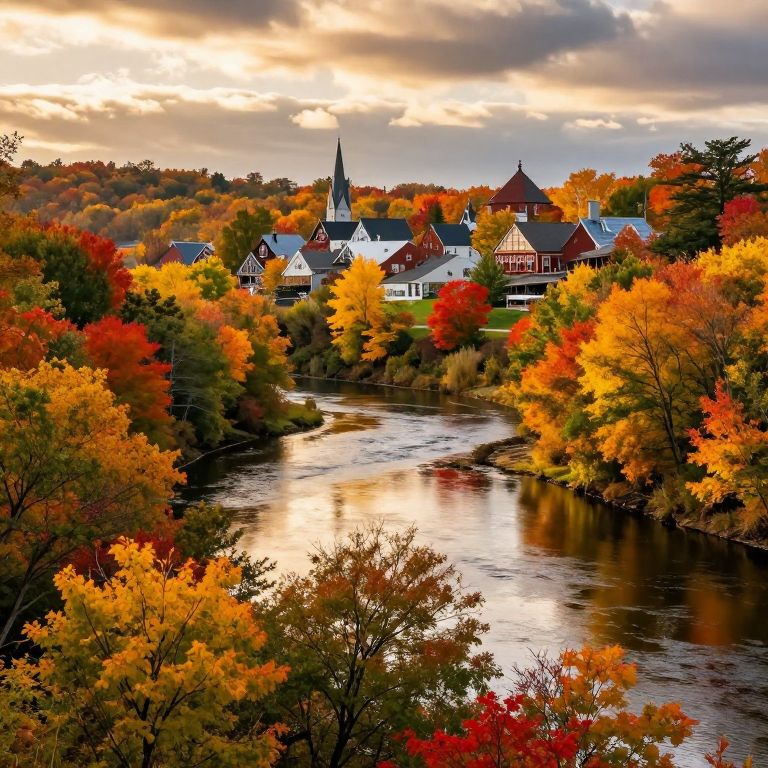 Connecticut autumn landscape with vibrant fall foliage, winding river reflecting colorful trees, cozy small town architecture in the background, soft golden sunlight filtering through clouds, hyper-realistic style with detailed textures and vivid colors.