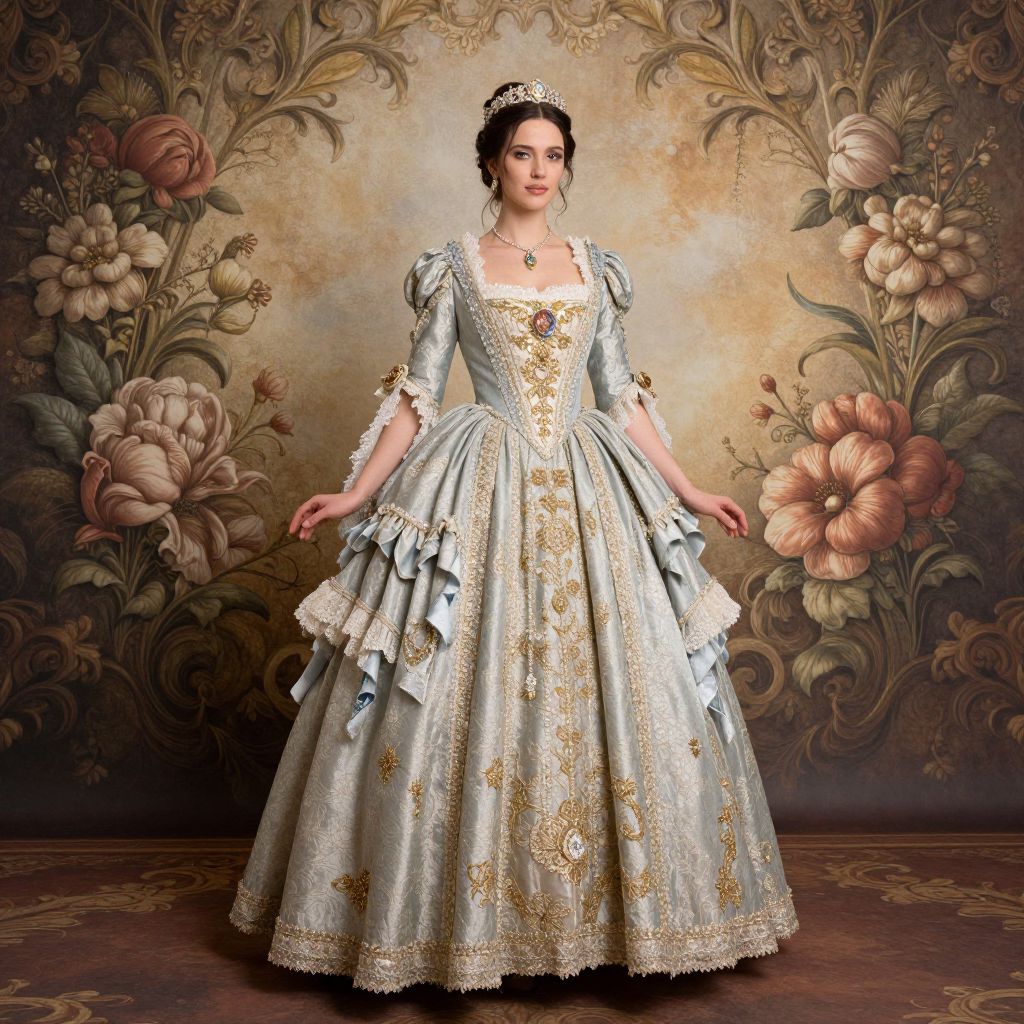 A woman in an elaborate, luxurious dress stands amidst a backdrop of intricate floral designs, evoking the opulence and detail of a fairy tale.