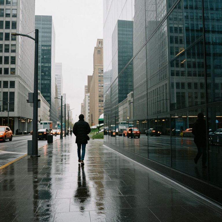 In a city where mirrored skyscrapers hold infinite reflections, the stillness of the wet pavement mirrors not just the buildings above, but the quiet solitude of souls navigating parallel worlds, each step echoing the weight of unseen burdens and unspoken dreams.