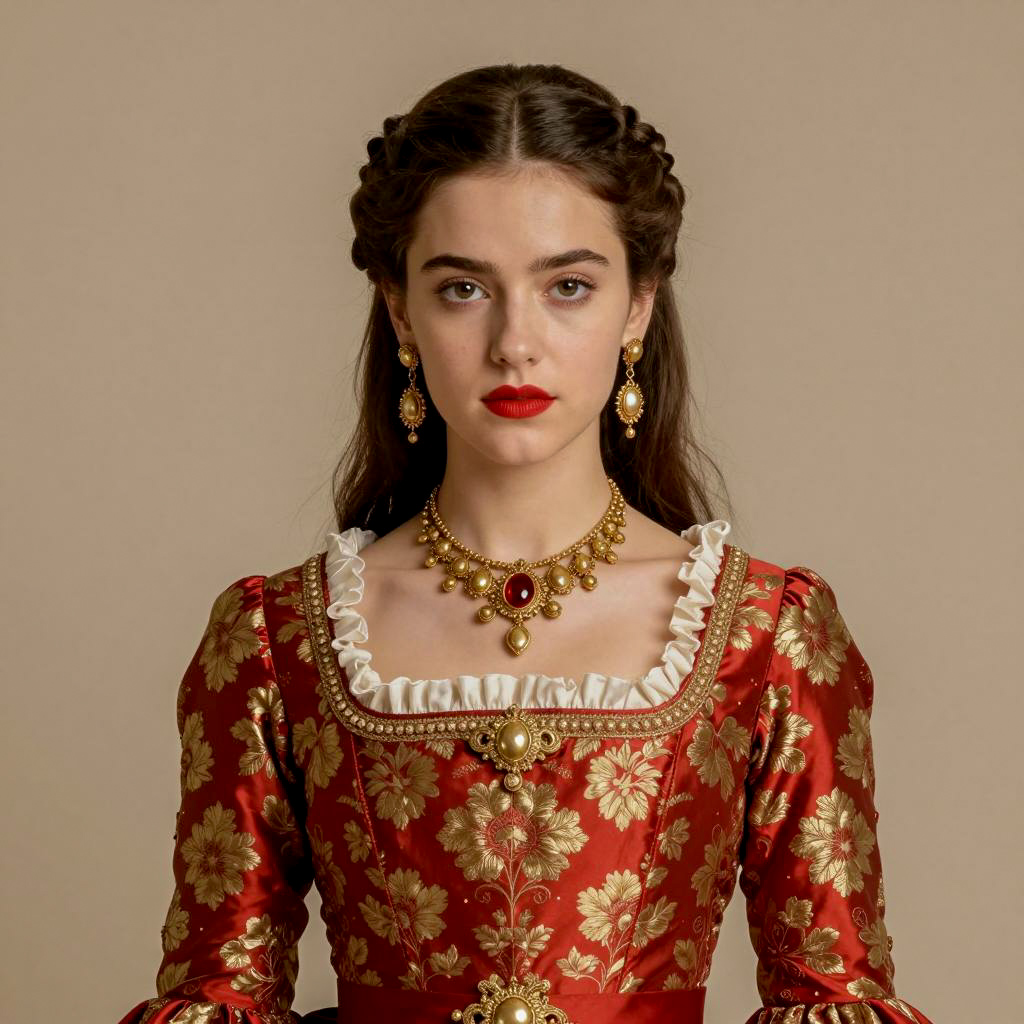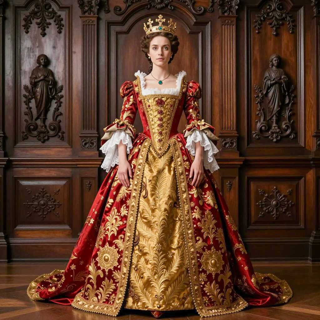 Photorealistic portrait of a young woman with long brown hair dressed as a winter queen. She is wearing a dark green, fur-trimmed medieval-style robe over a white tunic, paired with brown boots. A gold crown adorned with crosses rests on her head. The woman stands with hands clasped against a plain brown studio background, showcasing detailed Renaissance-inspired royal attire.